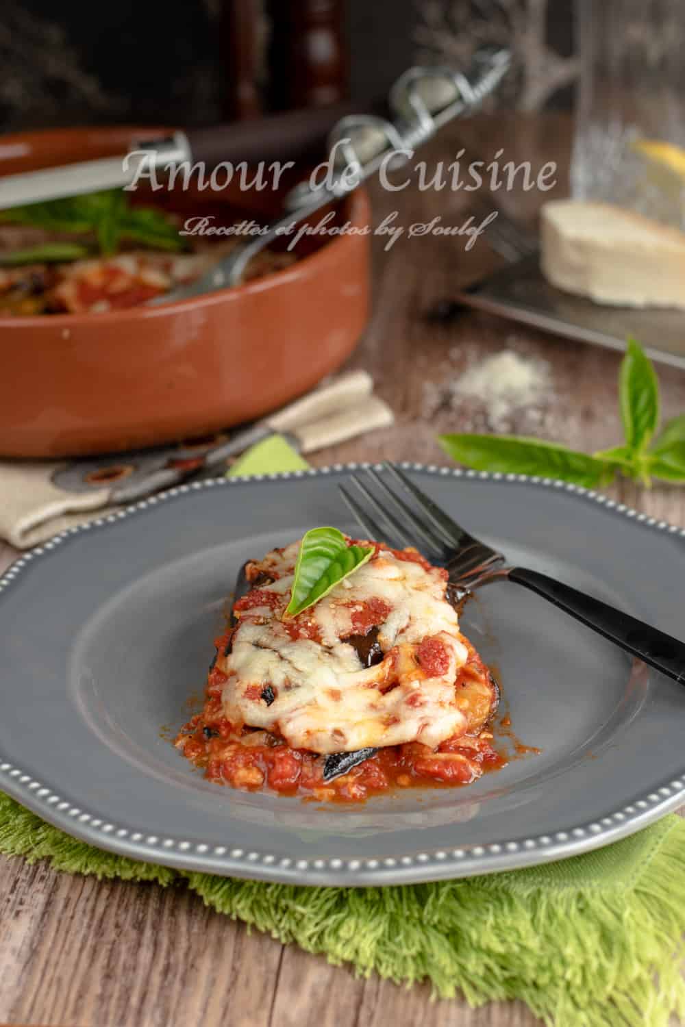 – Et on fait un montage du plat en intercalant une couche d’aubergines, une couche de sauce tomate, basilic, parmesan et mozzarella.