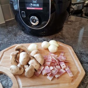 - faites revenir les oignons perlée, et la viande fumée de dinde coupés en morceaux, dans 1 peu d’huile.