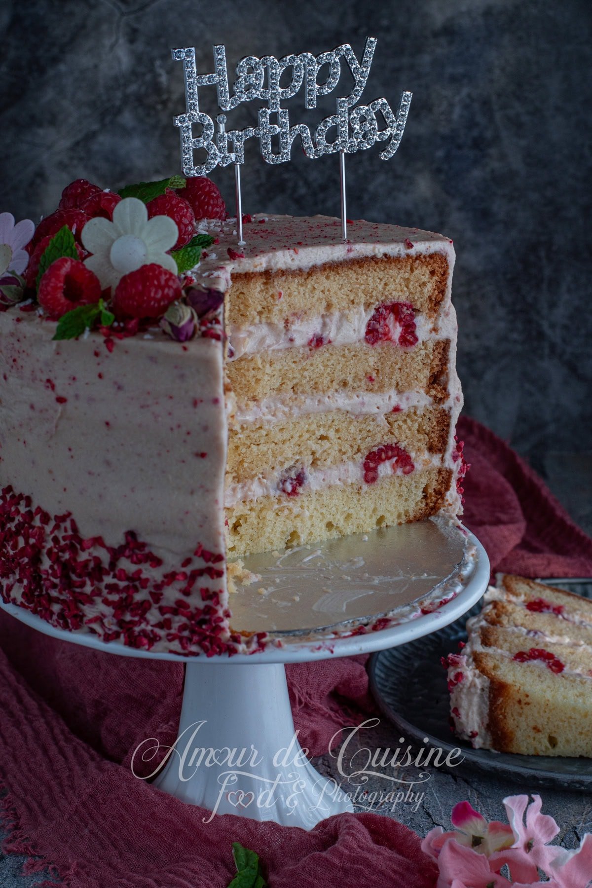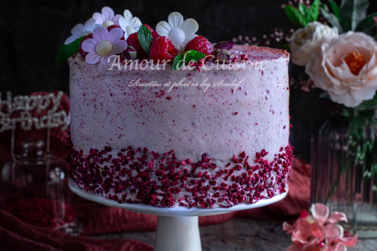 J’ai aussi ajouté de la poudre de framboises séchées à la crème mousseline, ce qui a donné un gout incomparable à la crème et au layer cake.
