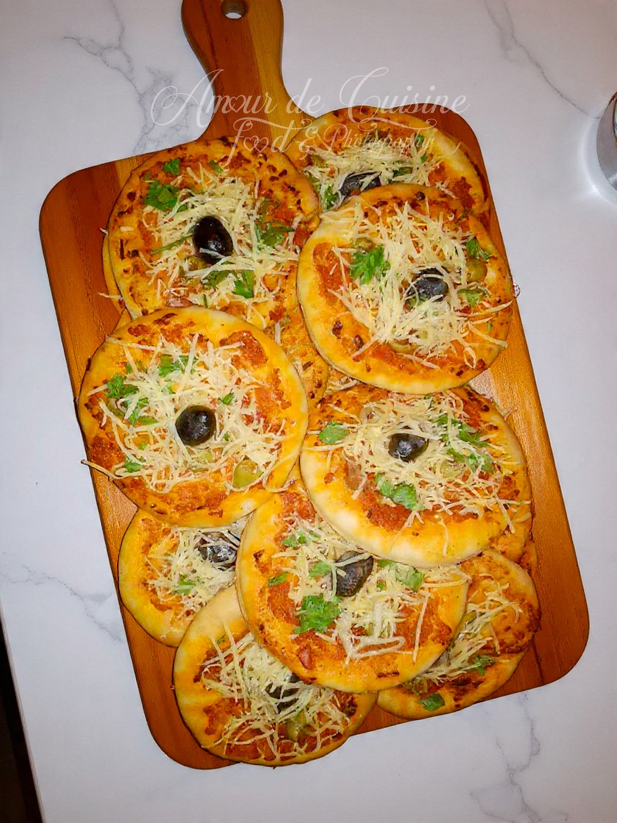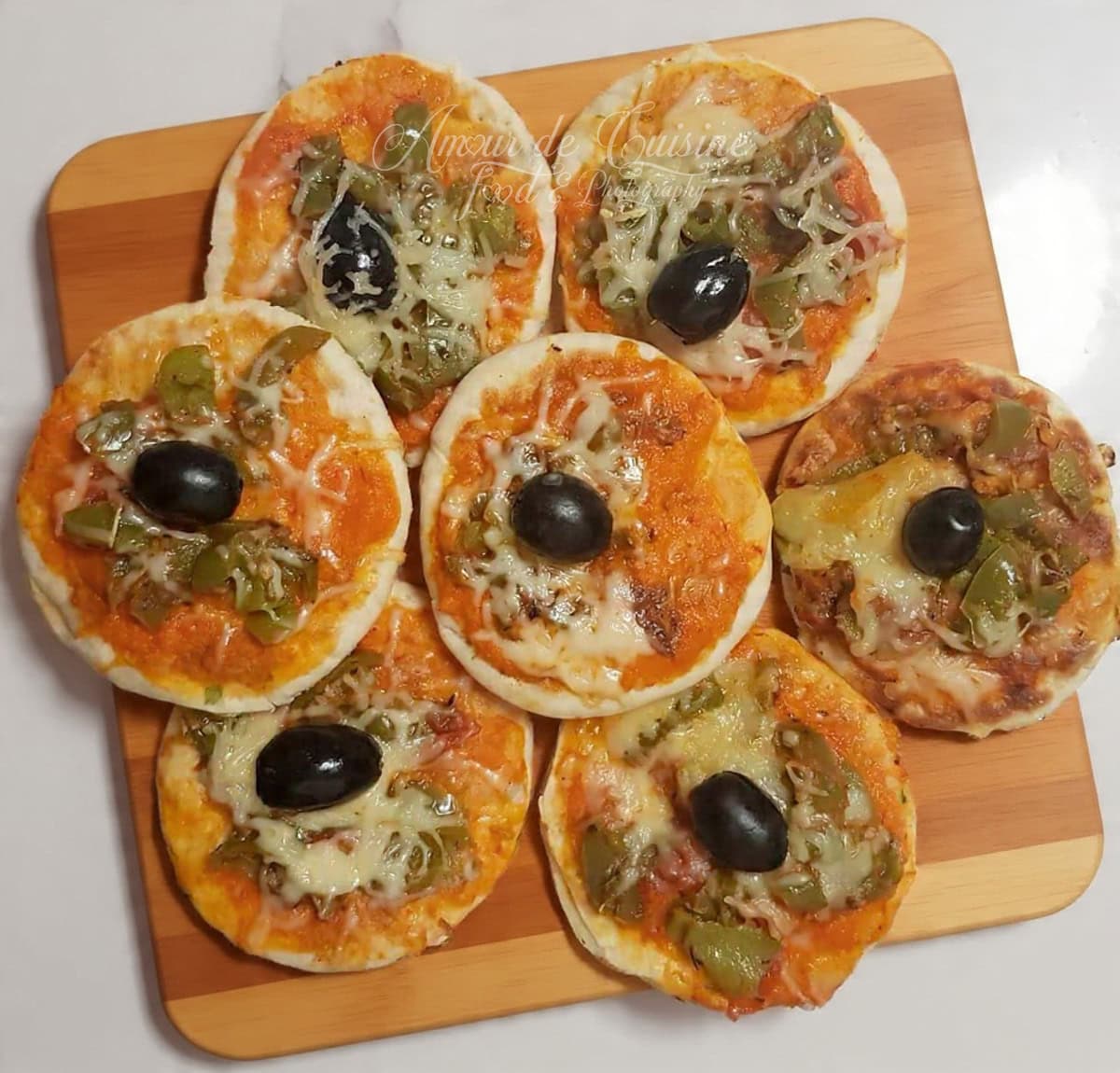 - Des mini pizza sauce tomate, poivrons et fromage.