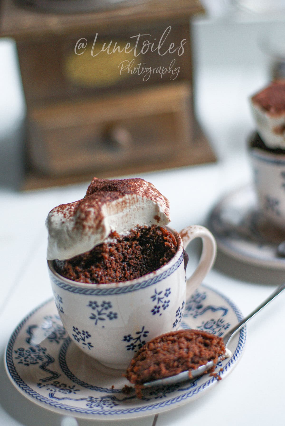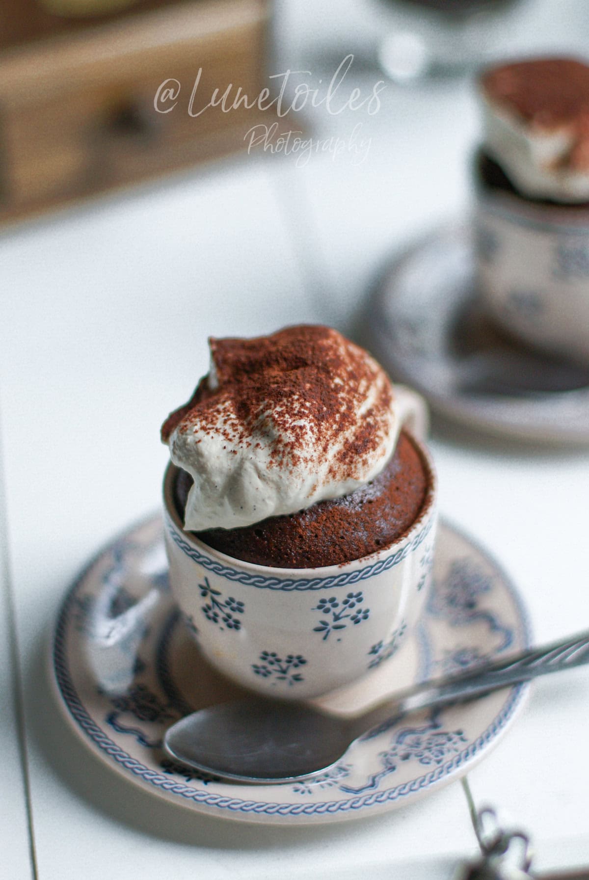 - Coiffer chaque mugcake bien refroidi d’une volute de crème au café, puis saupoudrer de cacao. Servir aussitôt,ou mettre au frais jusqu’au moment de déguster.