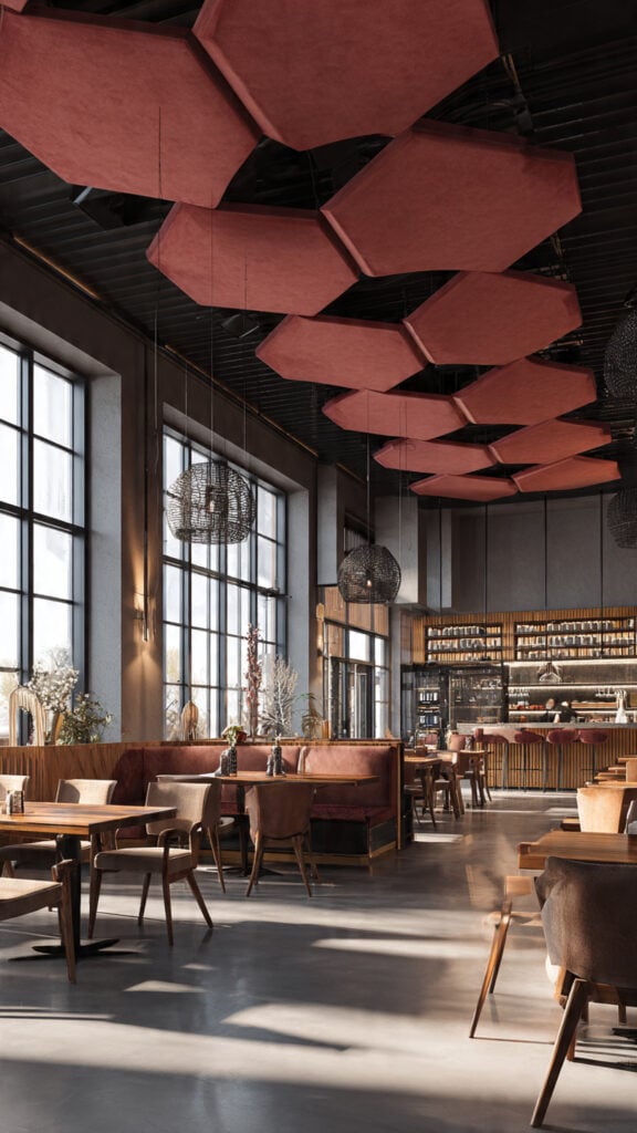 Il existe plusieurs solutions pour optimiser l’acoustique d’un restaurant. L’élément le plus utilisé est le panneau acoustique. Grâce à ses fortes capacités d’absorption, il permettra de réduire grandement le temps de réverbération.