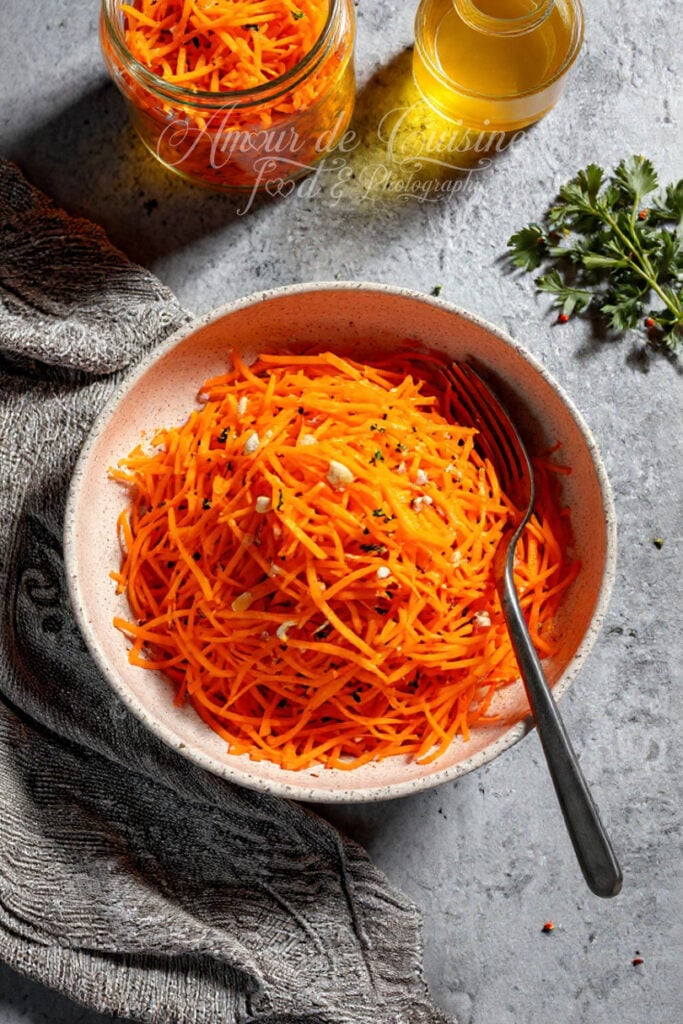 Salade de carottes râpées, fraîche et bien croquante, relevée par la moutarde de Dijon et une pointe de citron. Une recette simple et rapide pour tous les jours, parfaite en entrée ou en accompagnement, avec des astuces d’assaisonnement, des variantes et des conseils de conservation.
