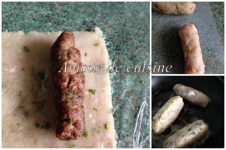 - couvrez bien chaque boudin avec le blanc de poulet ( si la viande de poulet vous colle a la main, mouillez un petit peu vos mains)