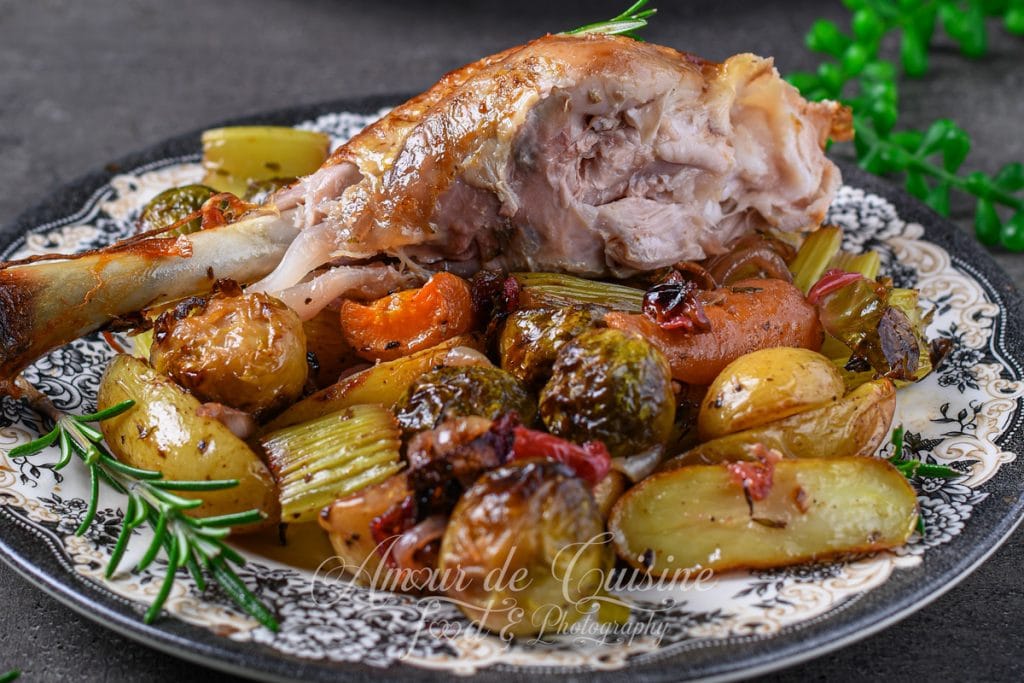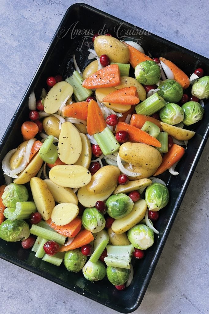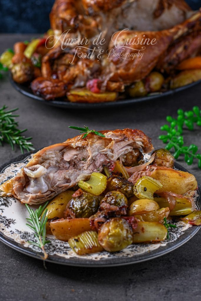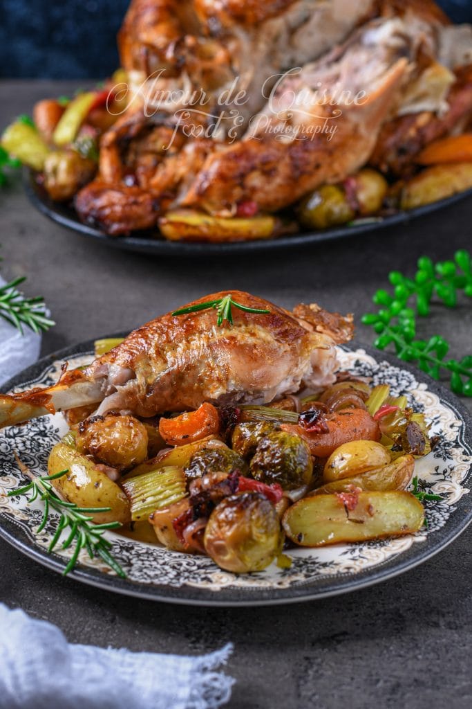 - Brown and finish : Remove the foil and continue roasting until the vegetables are nicely golden. At this stage you can add another spoonful of turkey juices for even more flavour.